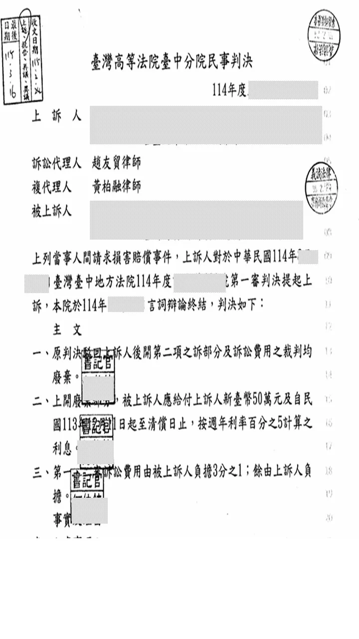 首頁 > 最新消息 > 最新資訊 > 本所律師為委託人上訴【請求損害賠償等案件】案件,獲改判一審判決,使委託人成功獲得逾新臺幣50萬元之賠償。