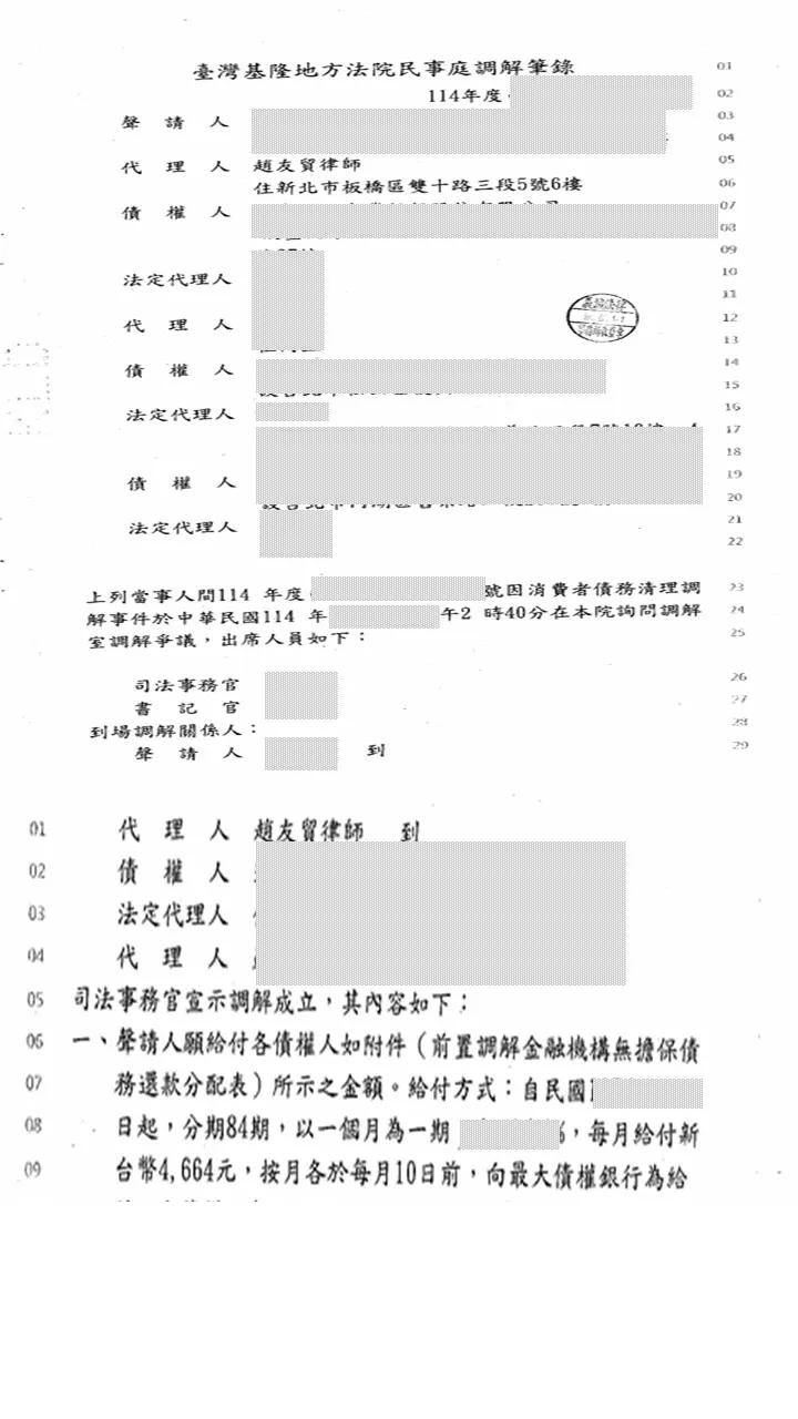 首頁 > 最新消息 > 最新資訊 > 本所律師為委託人調解【消費者債務清理條例事件】,為聲請人調解成立。