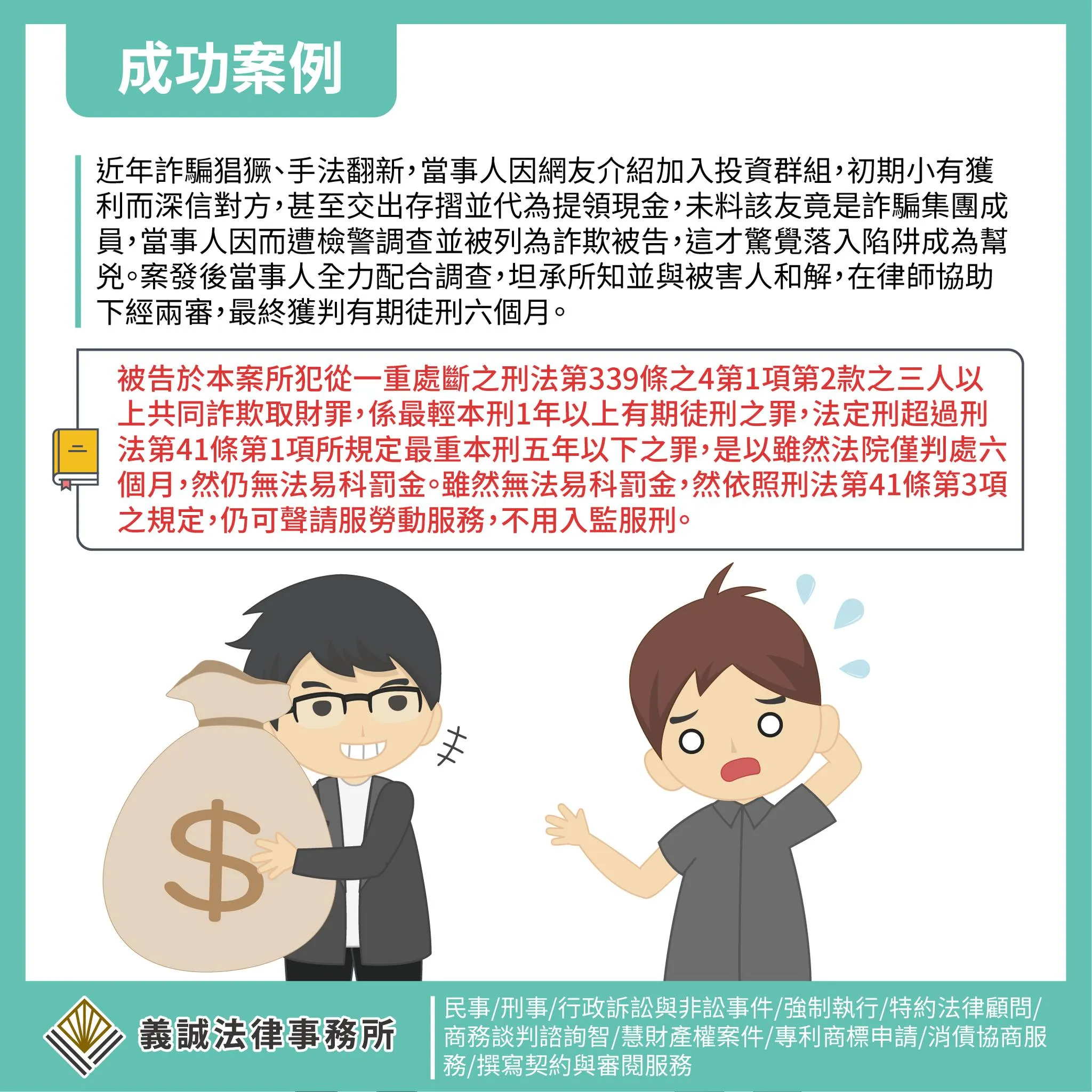 所幸案發後當事人一直積極的配合檢警的偵辦調查,對於自己對於案件所知道的內容老老實實地交代給警方,且與詐騙受害者們達成和解,並在律師專業的協助下經歷了兩個審級,最後終於替當事人取得了有期徒刑六個月的判決。